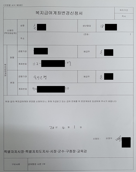 - 아동수당, 양육수당 수령 목적 : 복지급여계좌 신청서 , 복지급여 계좌변경 신청서 등