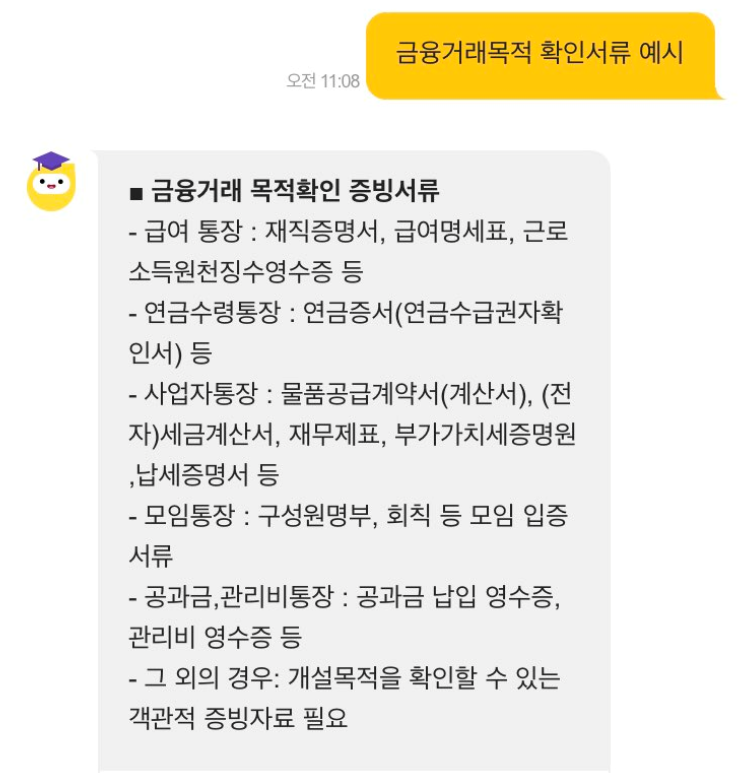한도 제한을 해제하려면 '신분증'과 '금융거래 목적 확인 증빙서류'를 지참하고 영업점 방문을 사셔야 합니다. 여기에서 금융거래 목적확인 증빙서류는 무엇이냐? 챗봇이 알려주는 걸 볼까요?